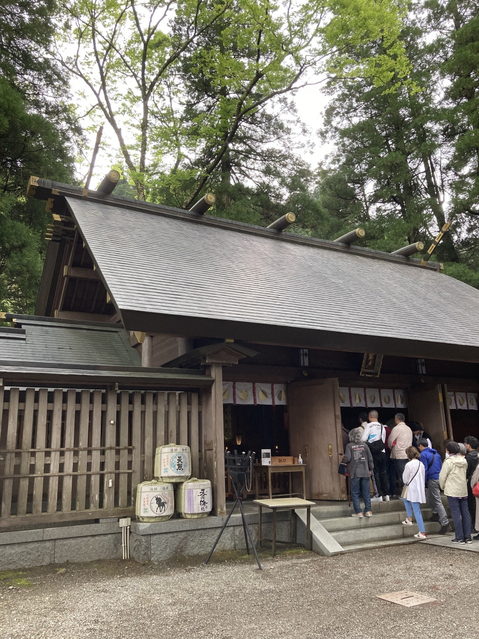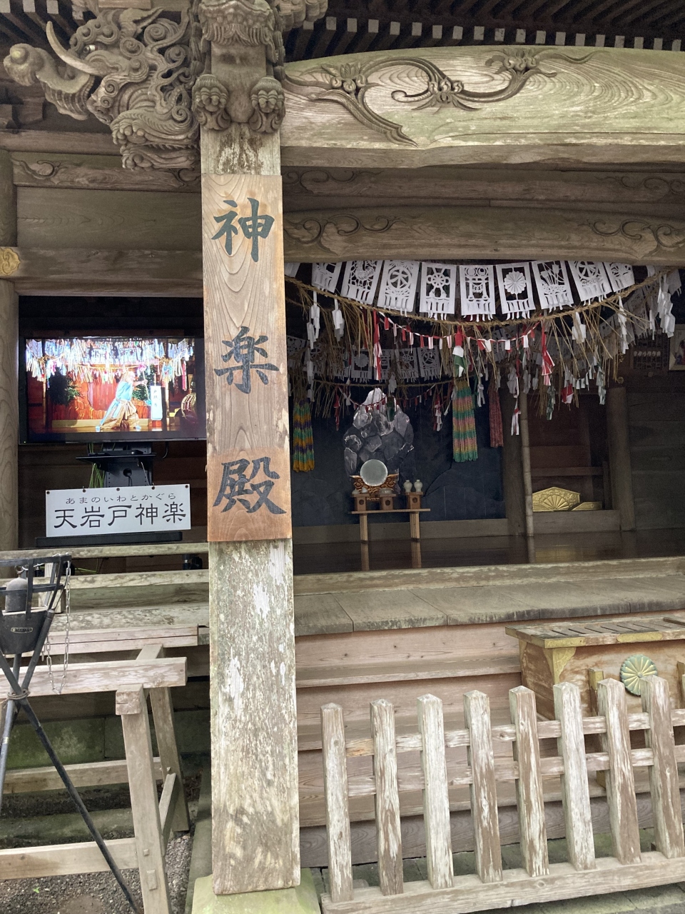 日本神話でもよく出てくる天岩戸が神社の後ろ側にあります。神社は正面から見ると大きな鏡が置かれていました。宮司さんが説明をしていただき後ろ側に回ると天岩戸が川を挟んで見えます。写真撮影は禁止でした。側に神楽殿も有り見応えがあります。