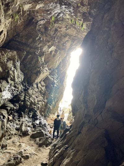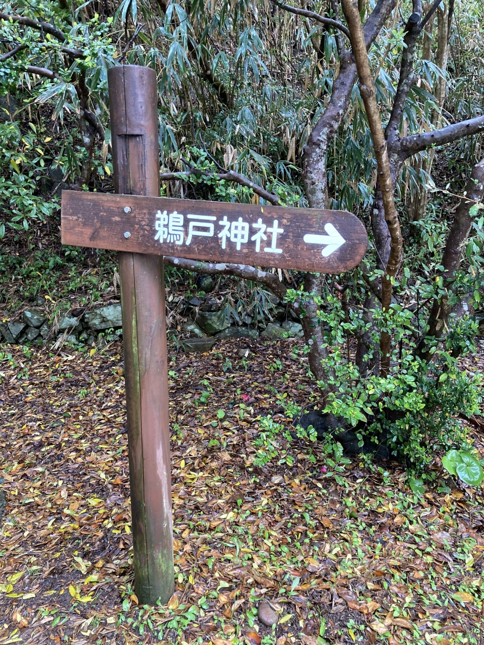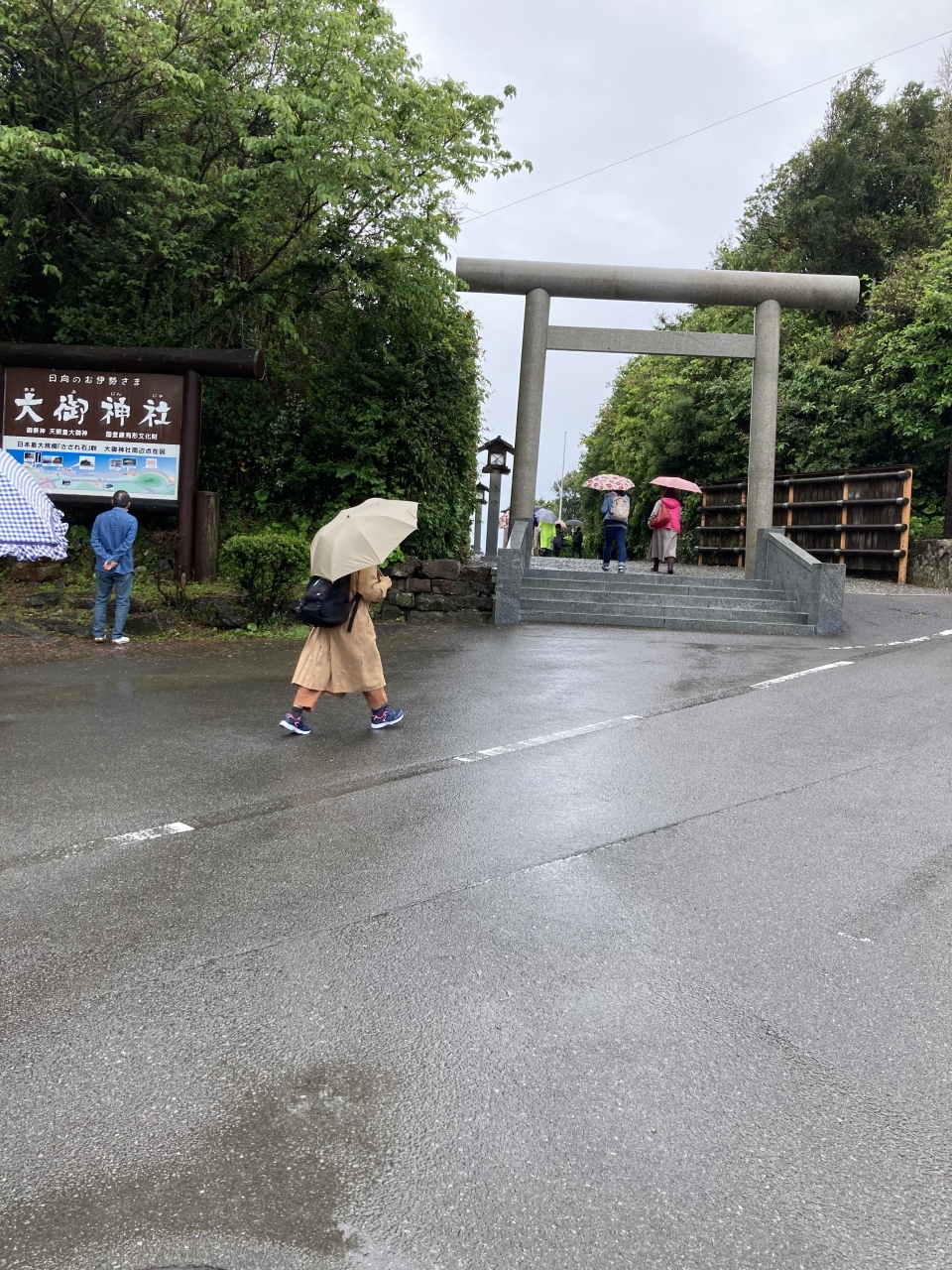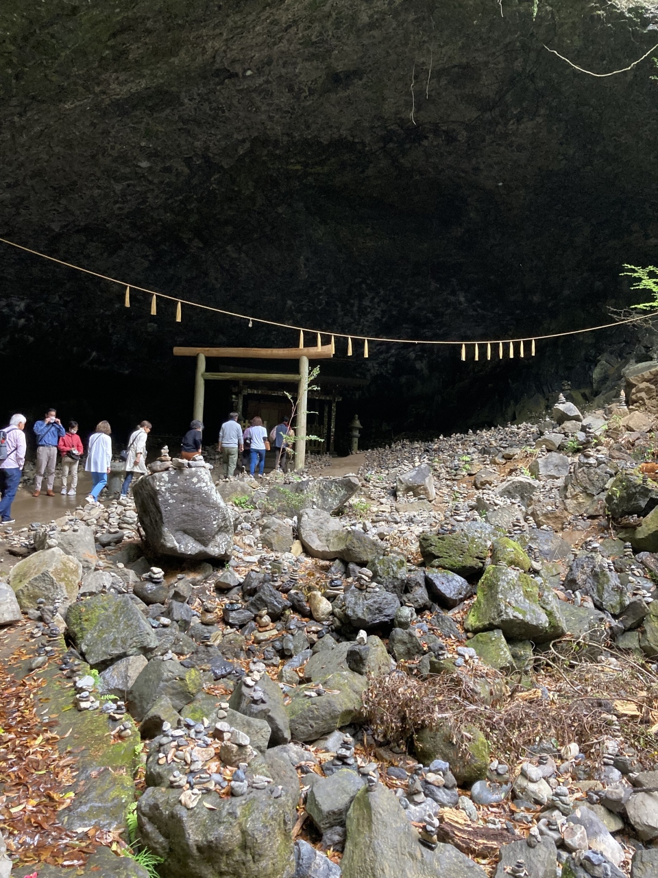 大御神社の摂社です。海に面して岩窟の中に存在します。巌窟の内部の大きさは高さ20m幅8m奥行き40mで天井側の隅ずみが尖っていることから、人の手によって掘られたものと思われています。内部の社殿前から入り口を見ると岩の間が天に昇る白龍の様に見えます。この日も朝から激しい雨が降っていましたが、運良く鵜戸神社に着いた頃には雨があがって、昇り龍を見て来ました。でも行く途中の厳しい階段は雨に濡れて大変でした。