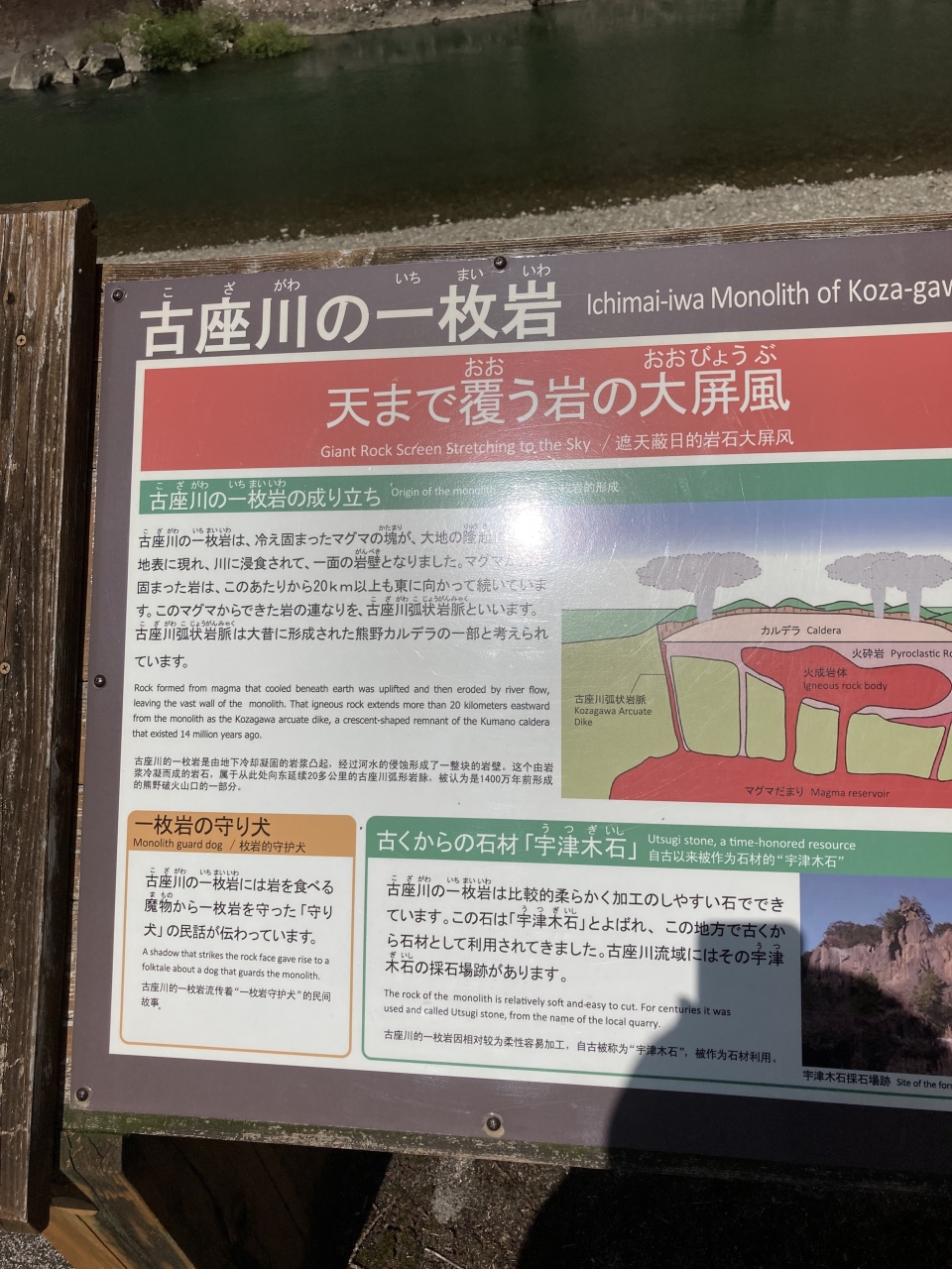 車で行きました。勝浦温泉から白浜温泉に行く途中で寄りました。海岸線からは結構山の中に入ります。一枚岩は大きくて本当に一枚岩なのと疑いたくなるほどそびえています。綺麗な川の水で子供たちが沢山遊んでいます。アウトドアには最適の場所です。