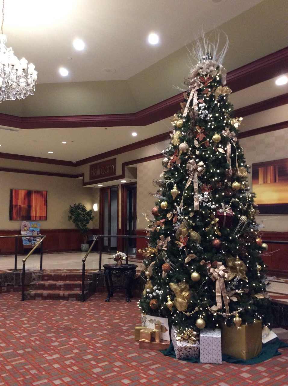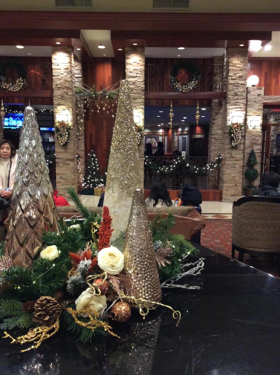 アメリカ東海岸ゴールデンルートのツアーで、総勢25人で宿泊を、しました。ホテルは入り口付近から素敵な、クリスマスイルミネーションでキラキラと輝いていました。ロビーに入っても、美しくクリスマスで飾り付けてありました。ホテルでは同じ旅行会社のツアーで出発日時の違う人たちとも出会い、お互いに情報交換をして、とても参考になりました。