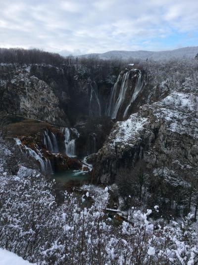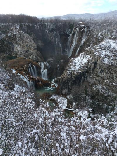 11月の後半にプリトヴィツェ湖群国立公園へ行きました。前日から雪が降って積もっています。この場所は内陸部になるのでかなり寒いです。私たちは事前に言われていたので服装や靴の装備は怠りなくしていたので何も心配なく歩けました。でもこの時期はお勧めです。観光客の方が少ないからゆっくりと見て廻れます。