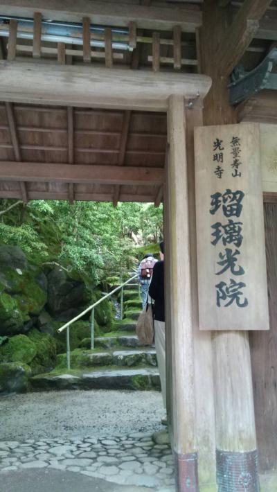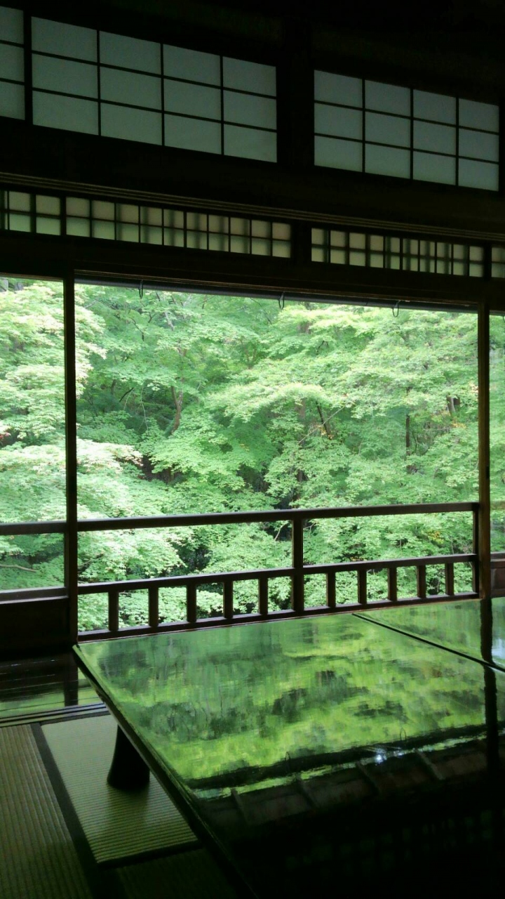 新緑の季節に行きました。年2回紅葉と新緑の時期にだけ一般公開をされます。入場料2000円なりです。瑠璃光院は大正の終わりぐらいから昭和のはじめにかけて12000坪の敷地にのべ240坪の数寄屋造りを改築されました。建築にあたった棟梁は中村外二で京都数寄屋造りの名人といわれています。築庭は佐野藤右衛門一統の作と言われています。緑、緑の庭園は心に残りました。