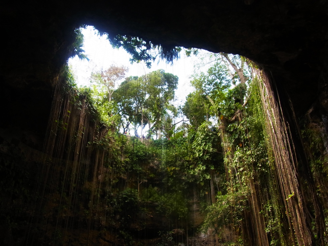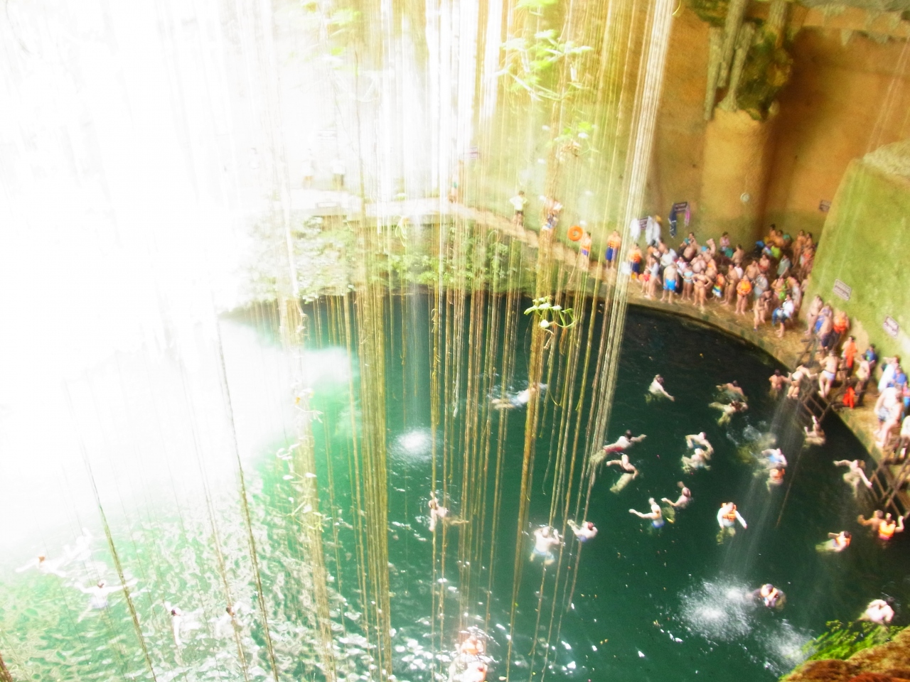 セノ―テに水に触れてみたいと思っていました。このイクキルにあるセノ―テは観光化していて、入場料を払って入ると、レストランもあってランチはここでバイキングを食べました。セノ―テには入りたい人はご自由にどうぞ、という感じです。上からも覗き込みができます。でも是非下へ降りて、セノ―テの水面から上を見て下さいね。幻想的な青の世界です。