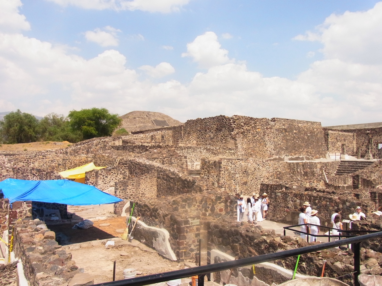 ティオテワカン遺跡では2番目に大きいピラミッドです。ティオテワカン人によって350年ごろに造られたようです。彼らが何処から来たのか?8世紀の謎の滅亡とともにどこに消えてしまったのか?今もって解明されていません。月のピラミッドの高さは42メートルですがやや隆起した処に建っているので頂上の高さは太陽のピラミッドとほぼ同じです。