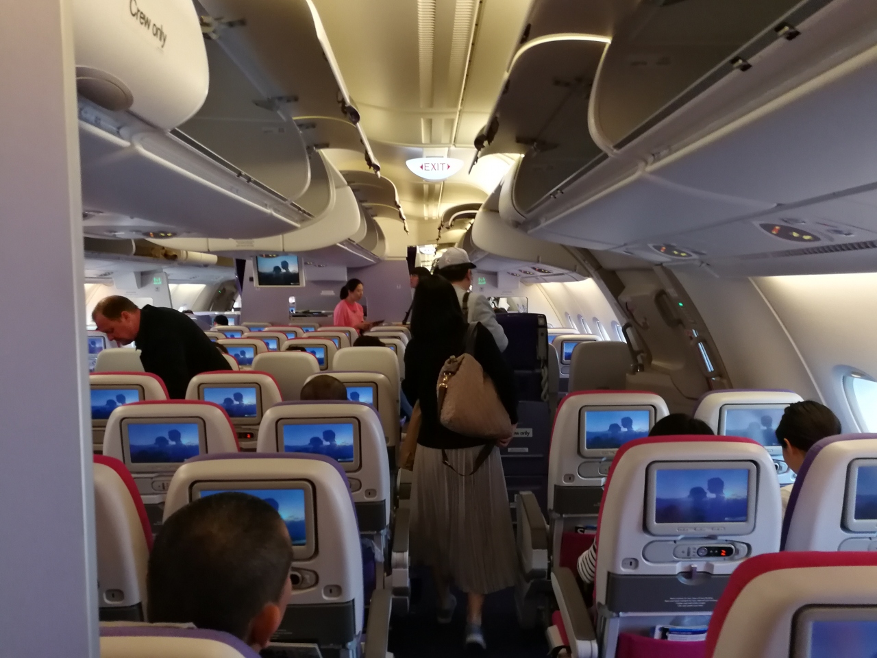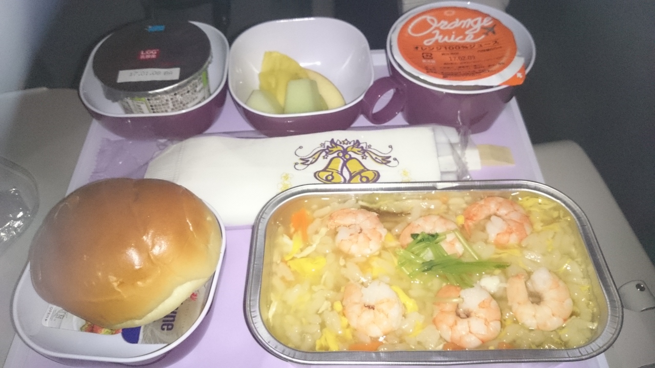 ロイヤルオーキッド・カラーの機内の雰囲気やCAさんたちの話し声・機内アナウンスによって、搭乗直後からタイランドを感じることができます。ただし、冷房はきつめです。