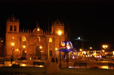 昼は青い空の下、山々に囲まれたクスコの土色の美しい街並みが、夜はライトアップされたカテドラルや噴水、山肌に点灯する家々の美しい夜景が見渡せ、まさに世界一美しいと言っても過言ではない広場です。