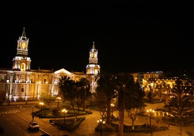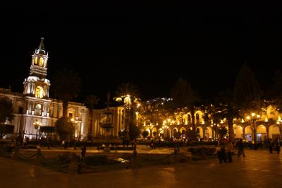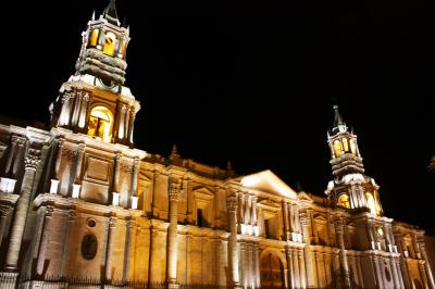 昼はアレキパ三名山をバックに壮麗な白い姿を、夜はライトアップされ光輝く美しい姿を楽しめるアルマス広場