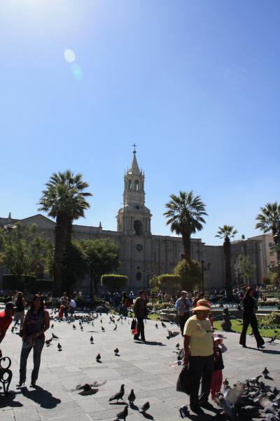 - アレキパは欧米系の観光客がたくさん訪れます。アルマス広場には地元市民やハトもいっぱい。