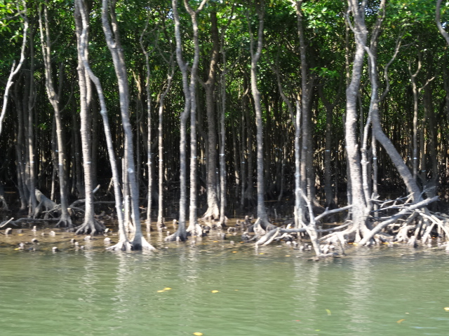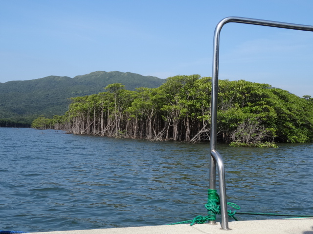 日本でマングローブの群生が見られるということで仲間川ボート遊覧ツアーに参加。ここは日本ですか?仲間川の河口から川をのぼって行くと両サイドにいろいろなマングローブが見る事ができます。川なので船も揺れることもなくゆっくり進みます。