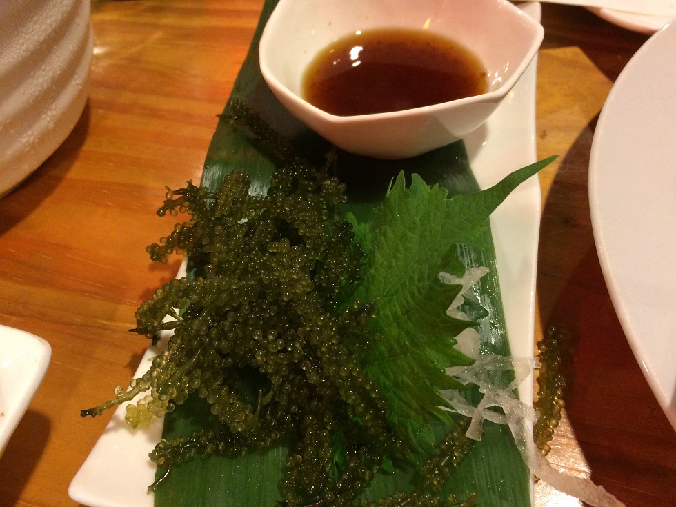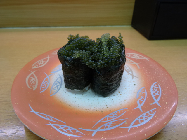 午後1時過ぎに入ったので席は空いていましが常にお客さんが入ってくる感じです。カウンター席に座り 流れてくる皿を見ると海ブドウ。メニューを見ると地元でとれた珍しい魚がネタに。3種盛りなどなかなか食べられないネタで満足です