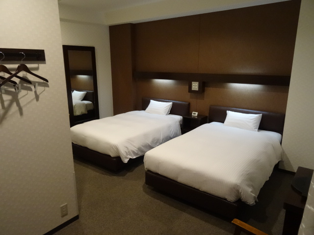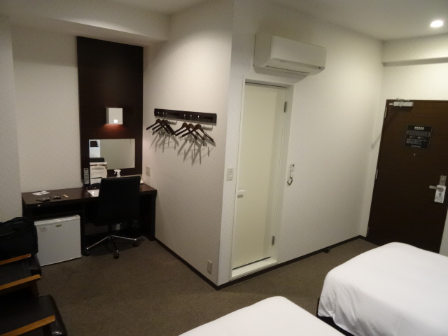ツインで広く使いやすい部屋です。大浴場もあります。一階エレベーター前には北海道の甲子園出場校の記念品が並んでいました。空港までは歩いて5~6分位なのですがホテルバスも出ていました。朝食は、朝早いお客さんが多いのか8時位に行った所がらがらでした。