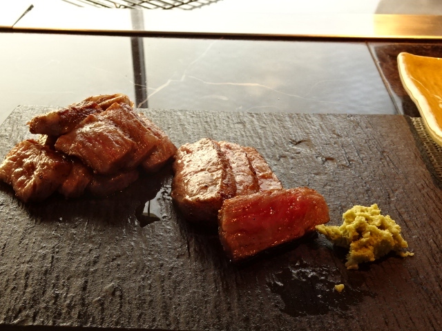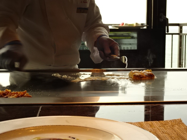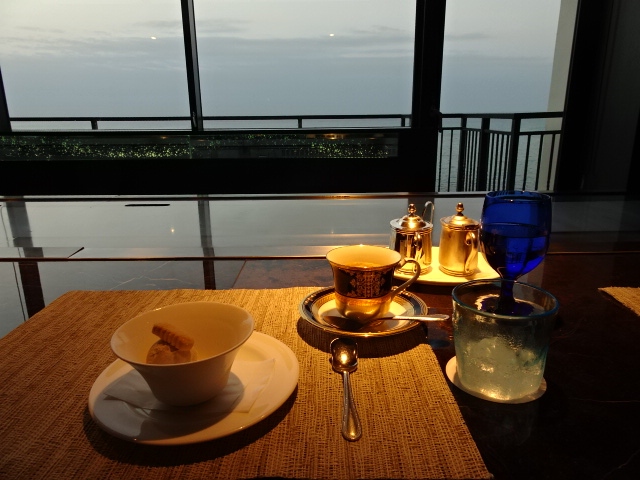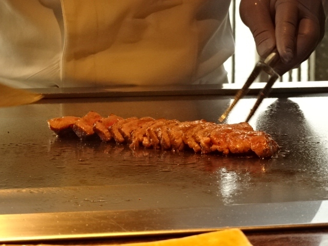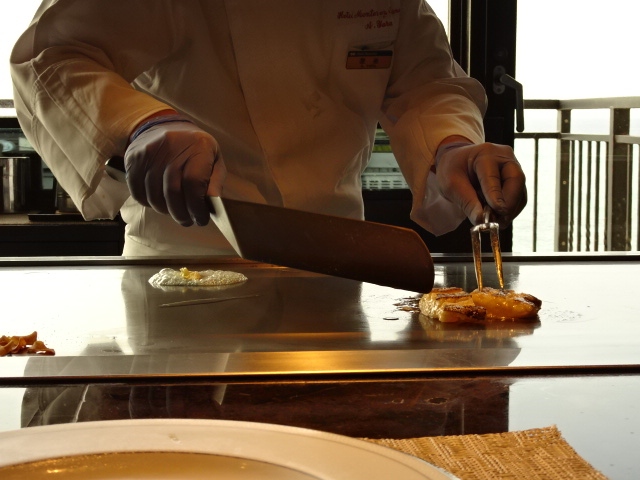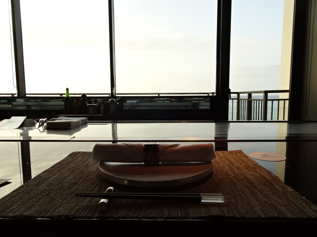 ホテルモントレ沖縄5階にある鉄板焼きを予約 海をバックにゆっくりと石垣牛を頂くことができました。コロナ禍ということもありすべてカウンター席の店内は、カウンター5席分を2人でとても広く使うという徹底ぶり。今回は特選コース 石垣牛と白老牛の食べ比べ。全席カウンターで沖縄の海を見ながら鉄板焼きは、他の個室の鉄板焼きのお店とは違いリゾート気分満載でした。
