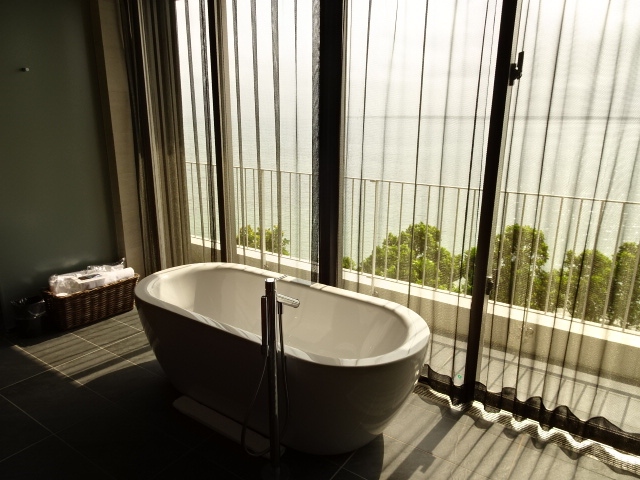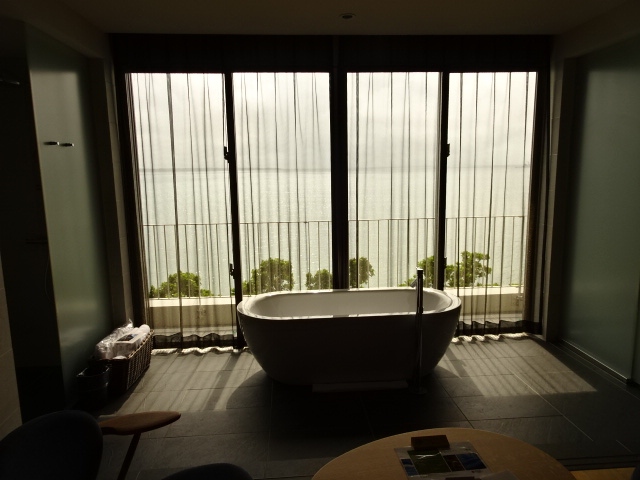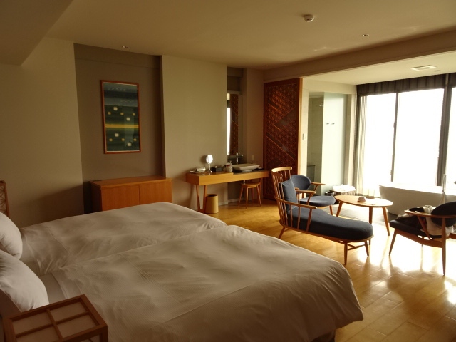 今回泊まった部屋は、新館5階の浮舟という部屋です。広い1ルームという感じの部屋で窓側にトイレ、バスタブ、シャワールームと変わった造りでした。窓には 遮光カーテンがありません。仕切りのない部屋にバスタブがそのまま置いてある感じなのであまり使い勝手わ良くない感じでした。1回入っただけであとは大浴場を使っていました。新館はすべてフロアごとにセキュリティがしっかりしているので安心だと思います