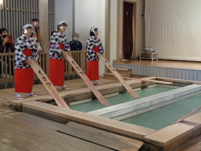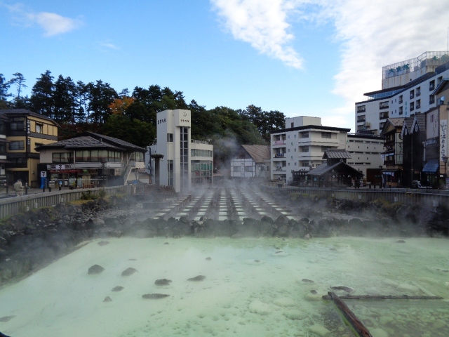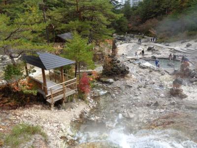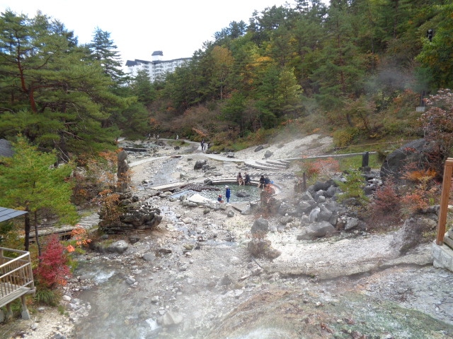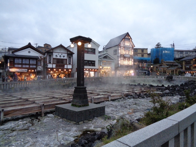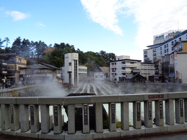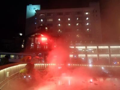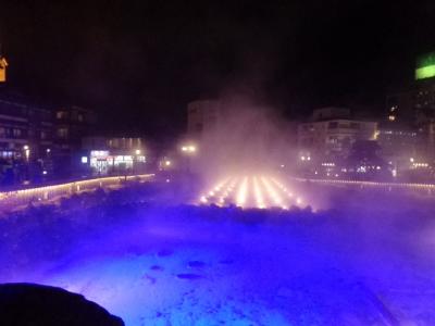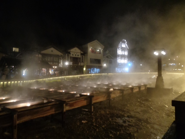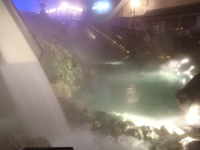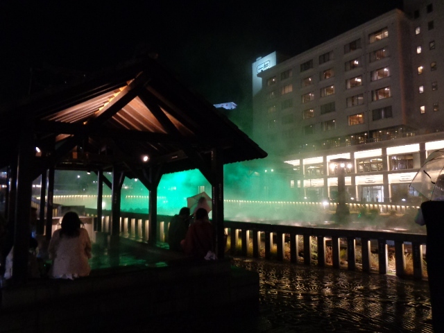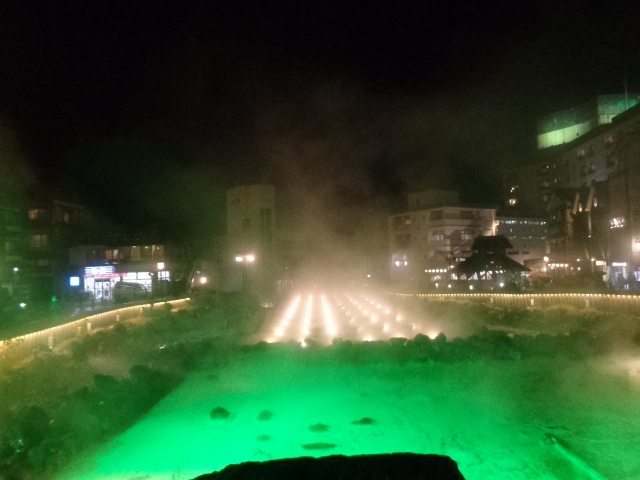 草津温泉は、大きな宿泊施設が少ないのでやはり宿泊客は、湯畑に集まってきます。夜の湯畑はカラフルなスポットライトがあてられとてもきれいでした。足湯に入りながらのんびりとライトアップされた湯畑を見て満足です