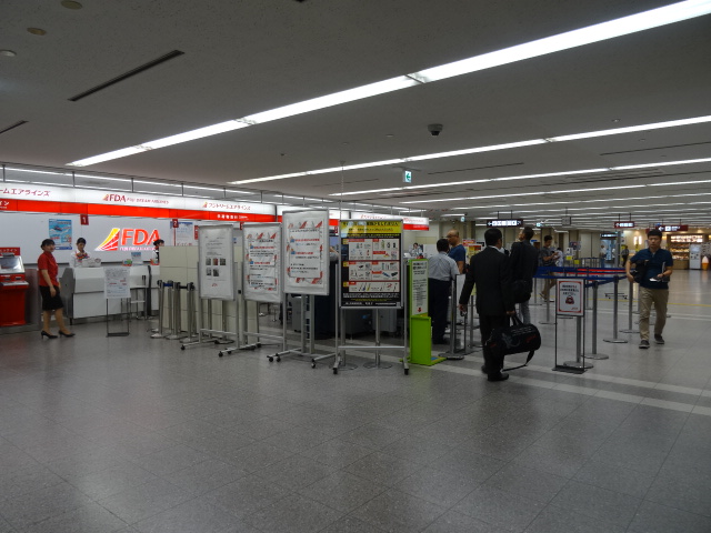 オーストラリア、ゴールドコースト空港の小型版的な空港。フジドリームのカウンターのみ。JALの手続きもフジドリームが兼務。船着き場のようなイメージでしょうか。手荷物検査の機械が1台しか動いていないので夕方に使用する時は、早めに手荷物検査を受けてなかの広い待合室にいた方が賢明かと思います。