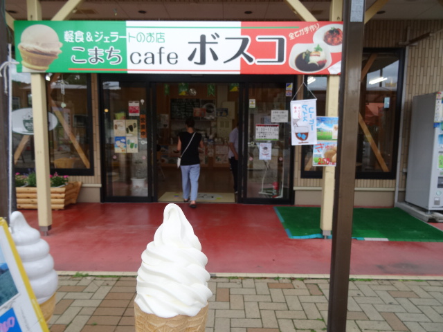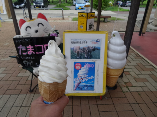 山形から秋田に向かう途中、有料道路に乗る前におがち道の駅で休憩しました。駐車場も適度に混んでいる程度で利用しやすい道の駅です。休憩がてら冷たい物でもと、地元ソフトクリームをいただきました。他には、ジェラートもお勧めのようです。