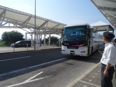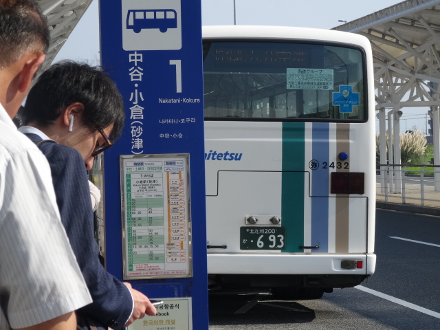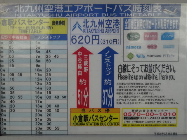 北九州空港は、バックが小倉、出島空港と言う事もあるのか自家用車で来る人が他の地方空港に比べて少ないせいかバスを使うお客さんが多くとても混み合っています。もう少し本数を増やしていただくとありがたいのですが。直行便は40分弱、市内バス停経由は、50分強。630円でPASMOなどが使えるのは、便利です。
