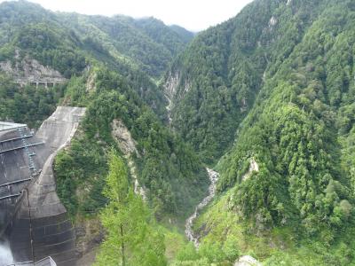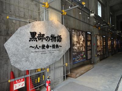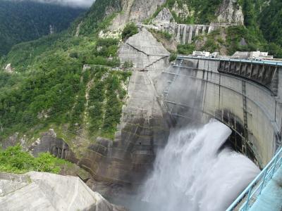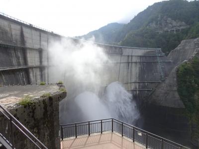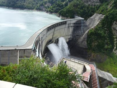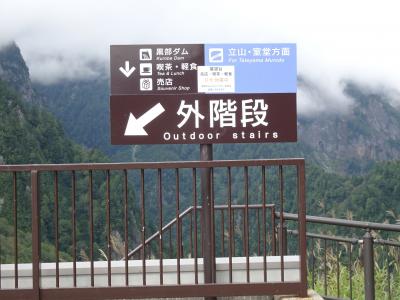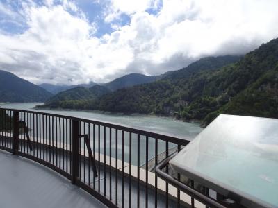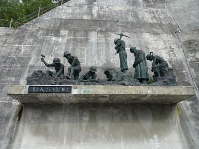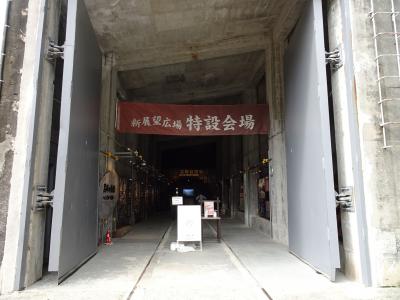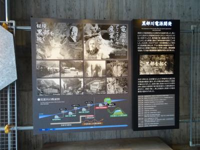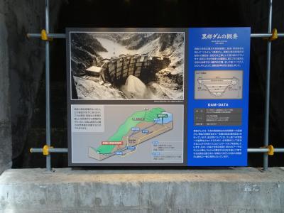 新展望広場・レインボーテラスは、ダム放水口から見ると東側にあるのでここから虹を見る時間帯は、午前中だと思います。テラスの横には特設会場があり黒部ダム建設の歴史がわかる映像23分が流れていました。ダムの歴史パネルも並んでいます。ここまで降りるのに約130段の階段。
