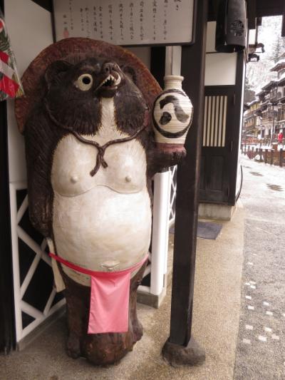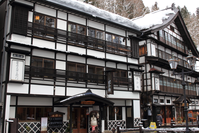 銀山温泉の銀山川に面した昔ながらの趣のある外観の旅館です。
