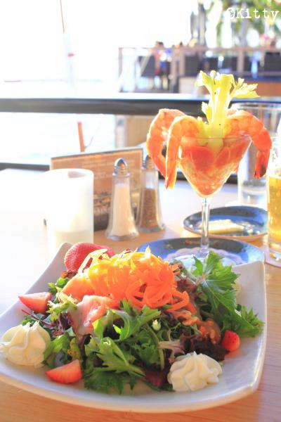 前菜に、シュリンプ・カクテルとクラ・ストロベリーとゴートチーズのサラダをオーダー。