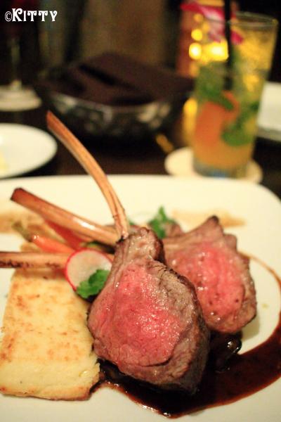 私は“Colorado Rack of Lamb”(子羊のオレンジソース添え、白ポレンタケーキ、ロースト春野菜とラディッシュ)(US46$)を注文。