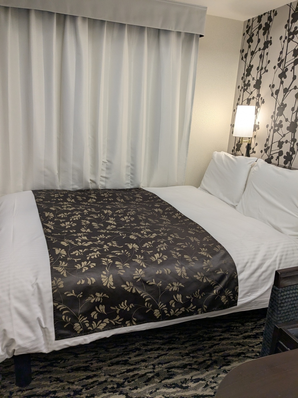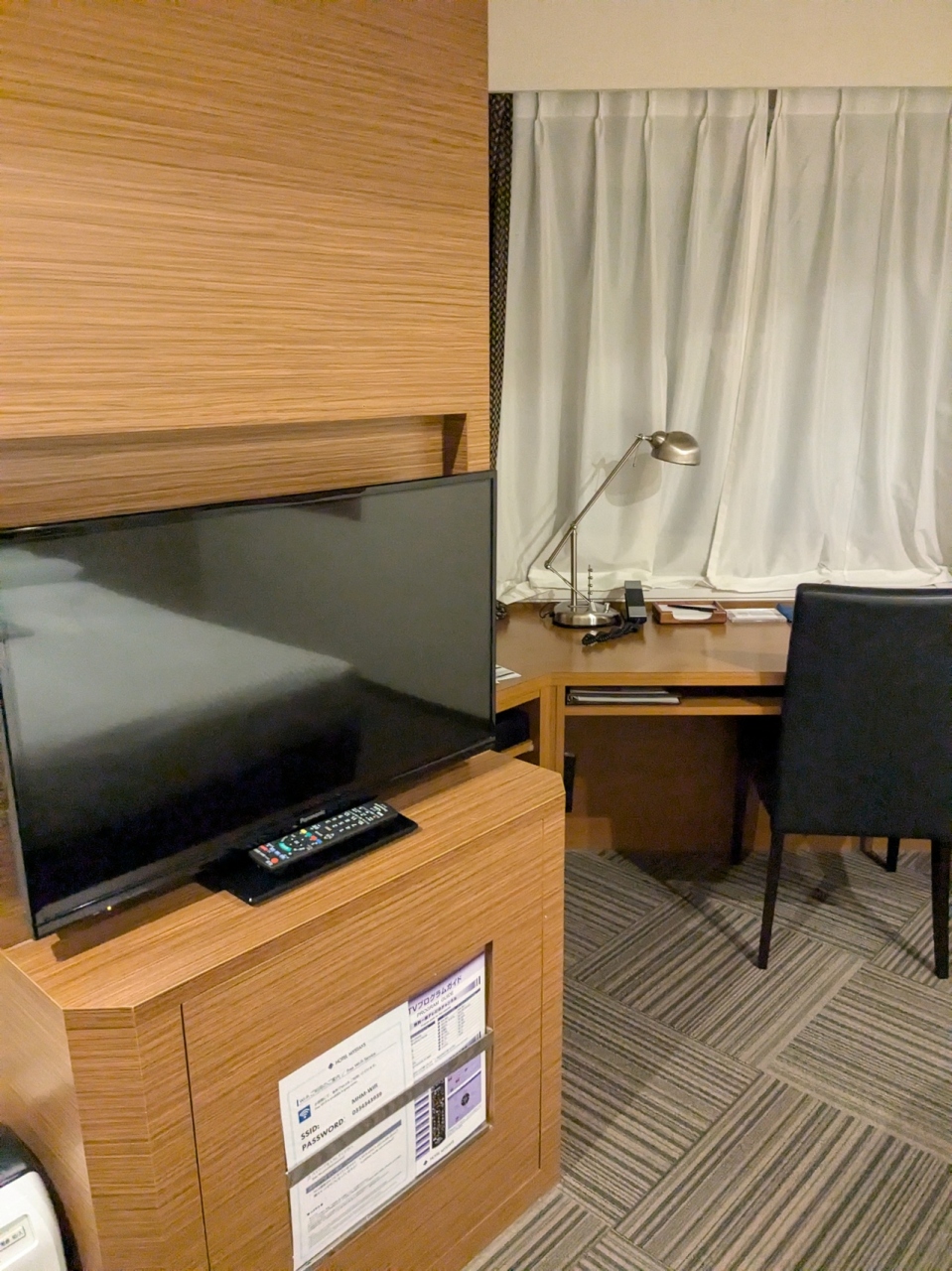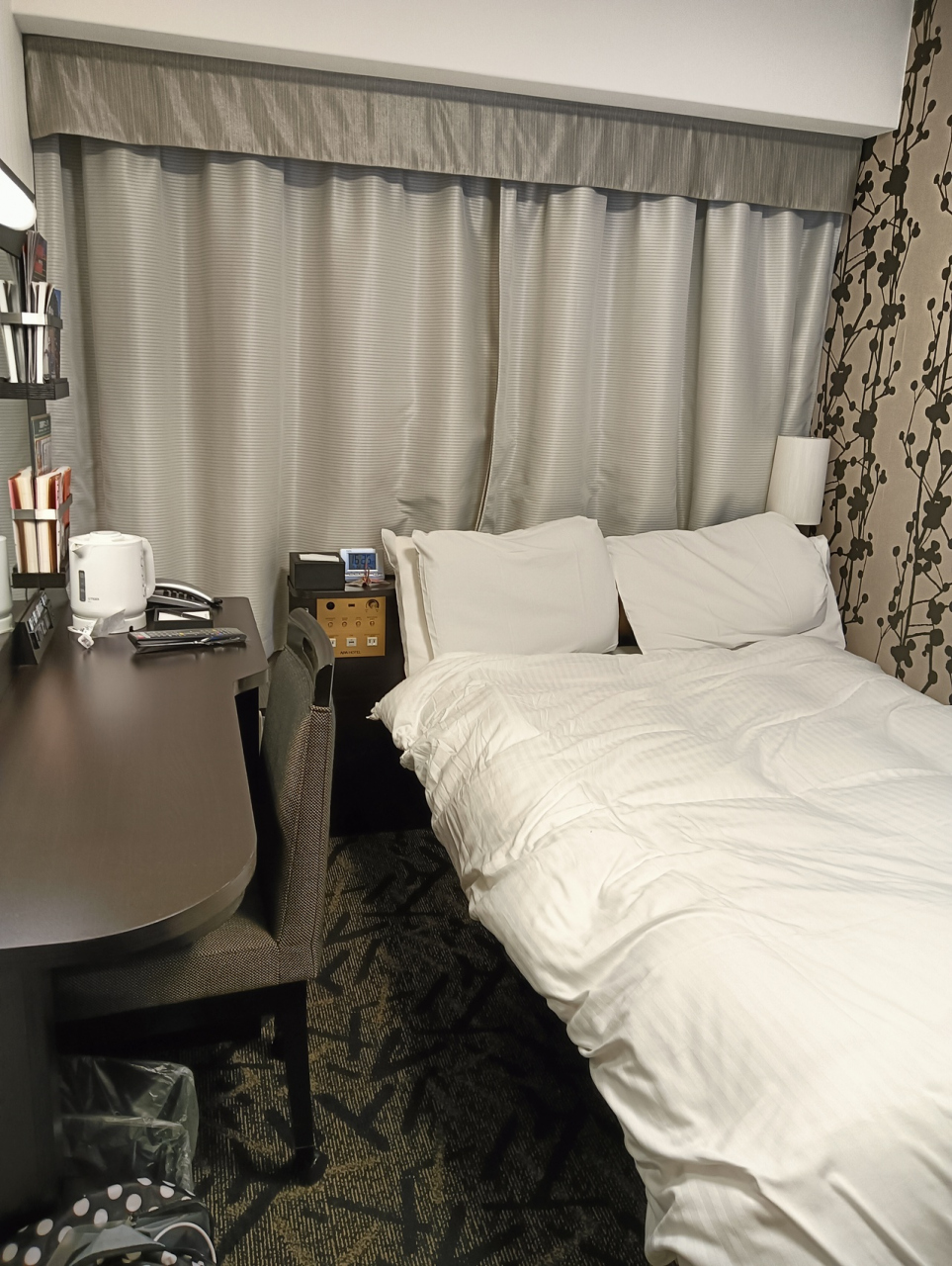 この頃のホテル高騰の折、旅行サイトで格安価格で予約。1番良いのは、駅から近い事と、分かりやすい場所です。大きな通りなので歩道橋階段使用しないと行けませんが、エレベーターや、商業施設のエレベーター使うと楽です。そして伊丹空港行きリムジンバスが、目の前から出てること。楽に空港に行けました。部屋は、シングルからダブルルームに変更だったのか、広めで良かった。飲食店、ショッピングモールたくさんあり、素通りでも大丈夫でした。