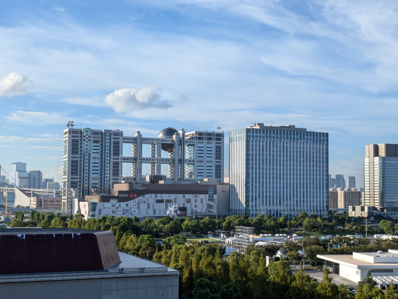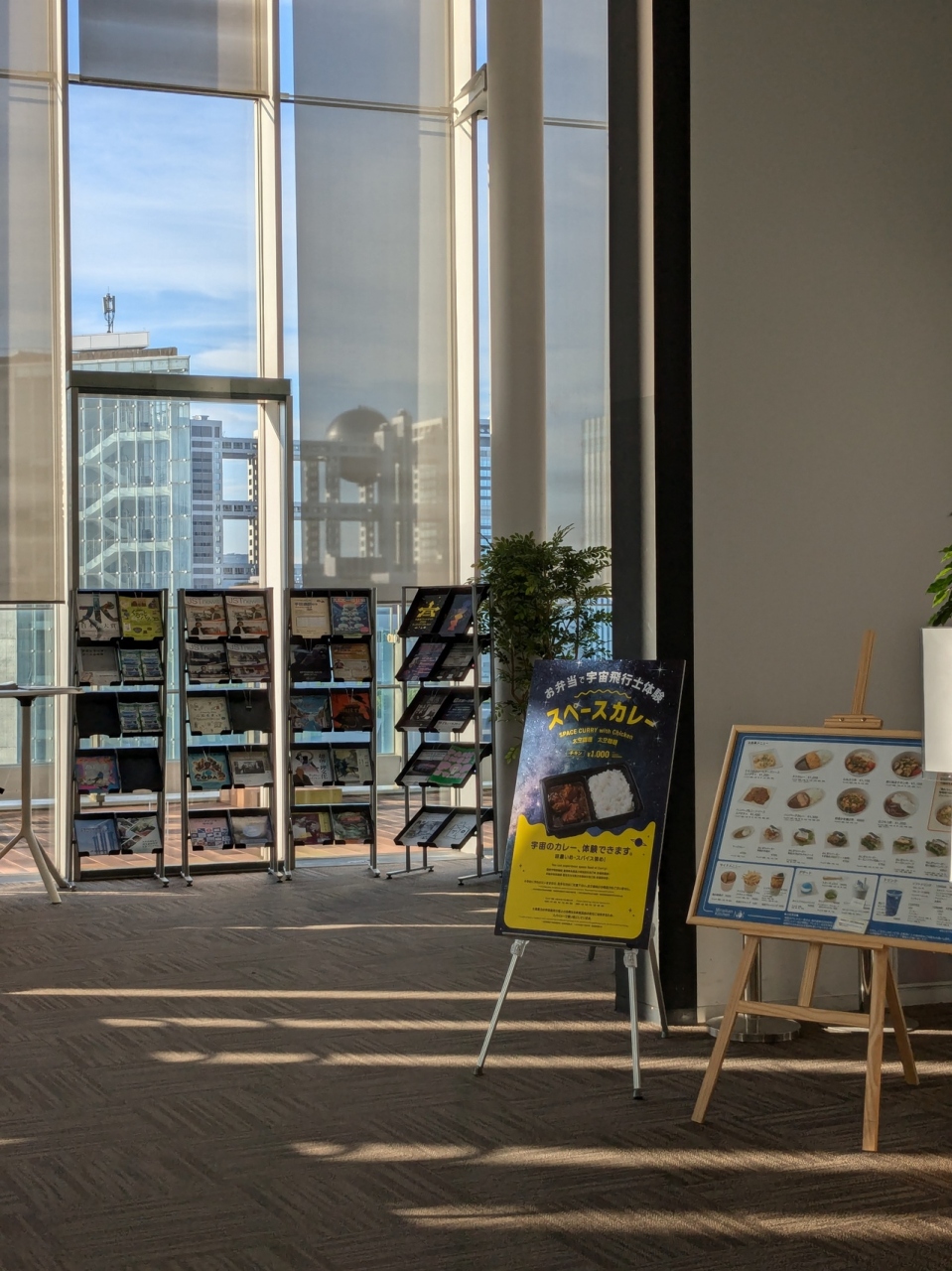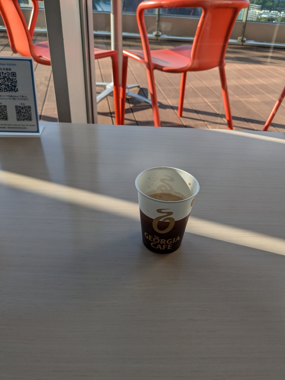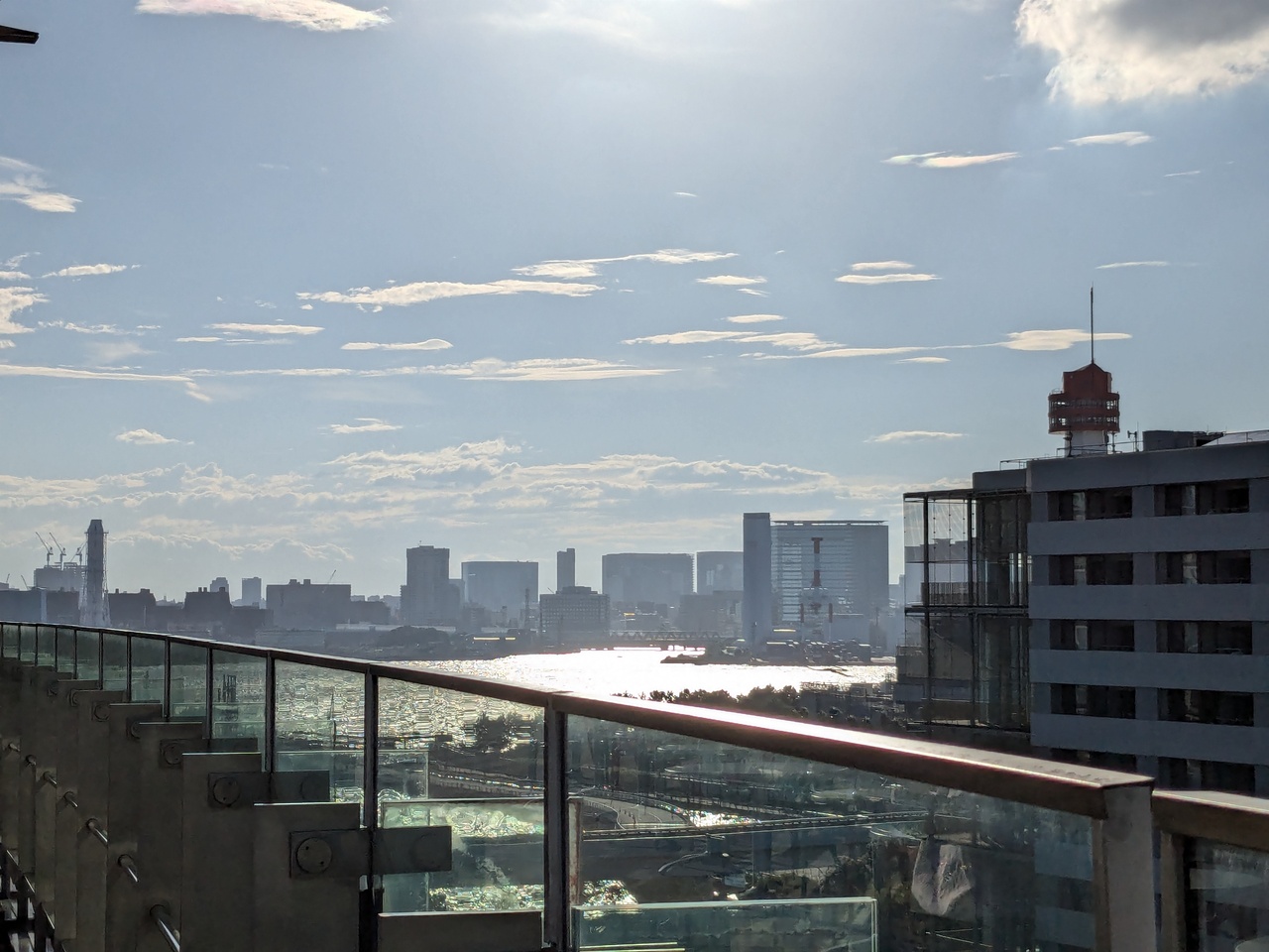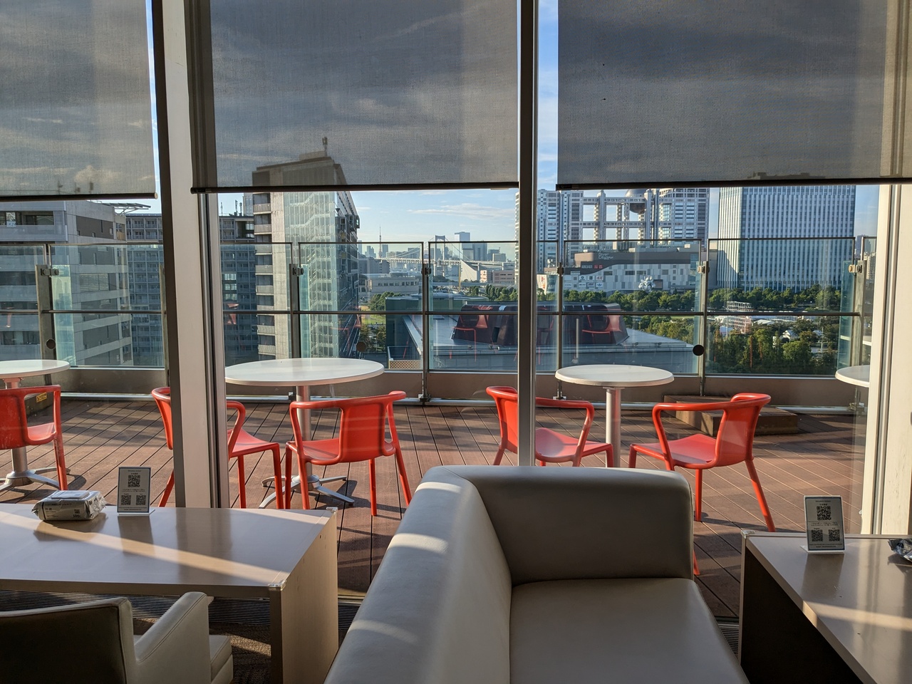 日本科学未来館の最上階にあるカフェ。展望台だけでもみること出来ると思います。営業時間は、午後5時までなので夜景は、無理ですね。コーヒーを頼みましたが、ファミレスのフリードリンクのようで、紙カップ渡され自分で入れます。250円で安いですが、それなりの味です。暑すぎて風景楽しめる感じではないけど、出て写真撮ってみました。