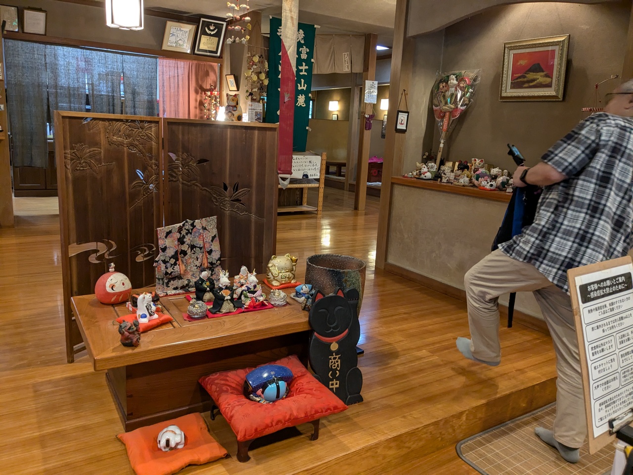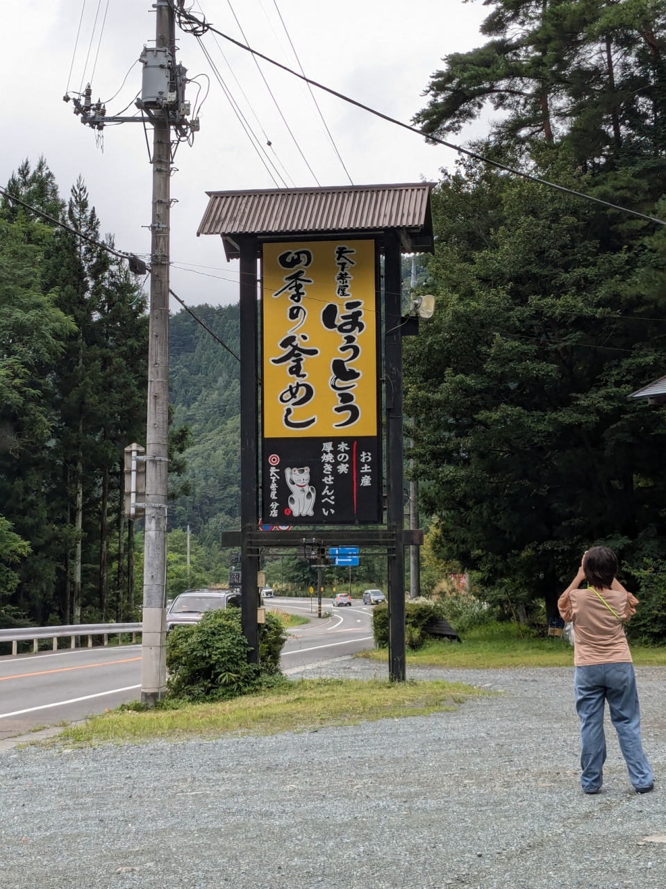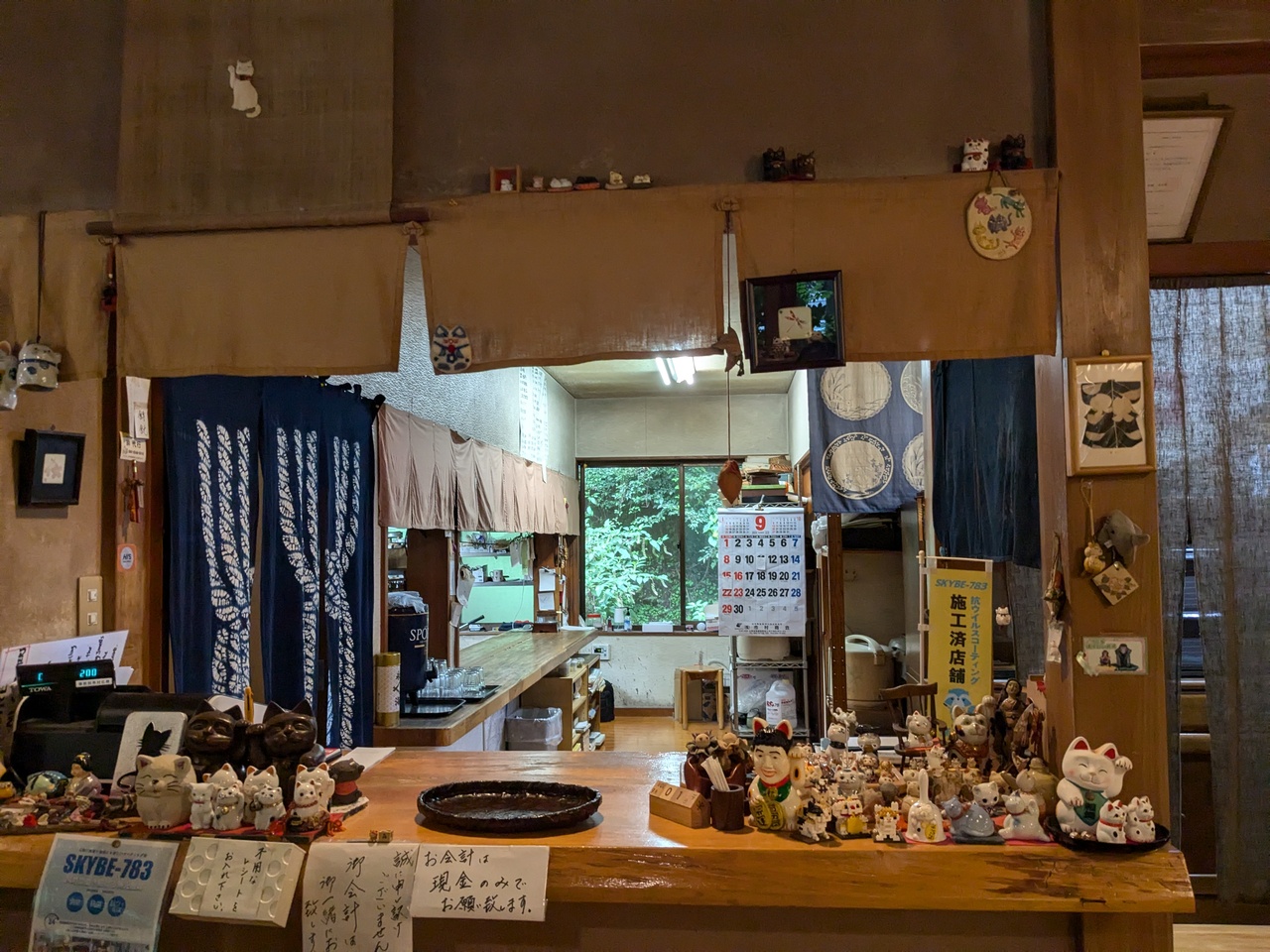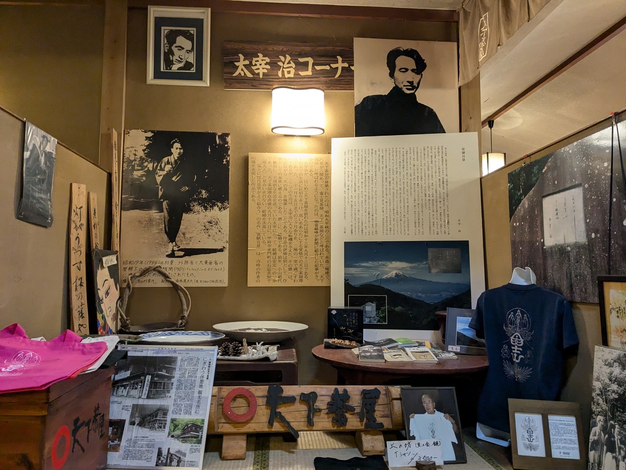 山梨の名物ほうとう鍋がいただけるところで、バスツアーでの昼食になります。古い建物で風情がありました。団体なので広間でしたが、玄関から置き物が可愛いかったですよ!ほうとう鍋ですが、かぼちゃほか野菜たっぷりのほうとう鍋でした。麺が硬かったのが残念でした。他の人は、満足していましたが。天下茶屋分店て看板あり。太宰治の富獄六景にちなんで、コーナーがありました。