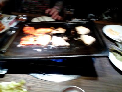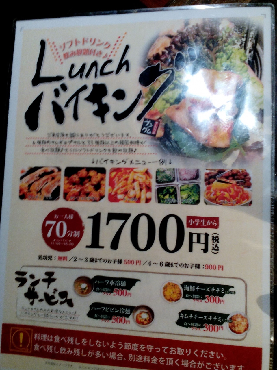 ランチ1700円、6種類のサムギョプサル食べ放題です。ほかにもサイドメニューや人気のチキン、チゲ類、サラダ等たくさんあるよ。ドリンクもフリーです。時間制限70分ですが、結構食べれますよ。若い人は、たくさん肉盛って焼いていましたよ。並ぶ時もあるようですよ。