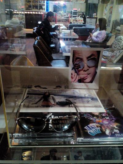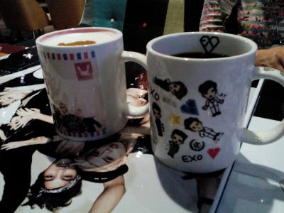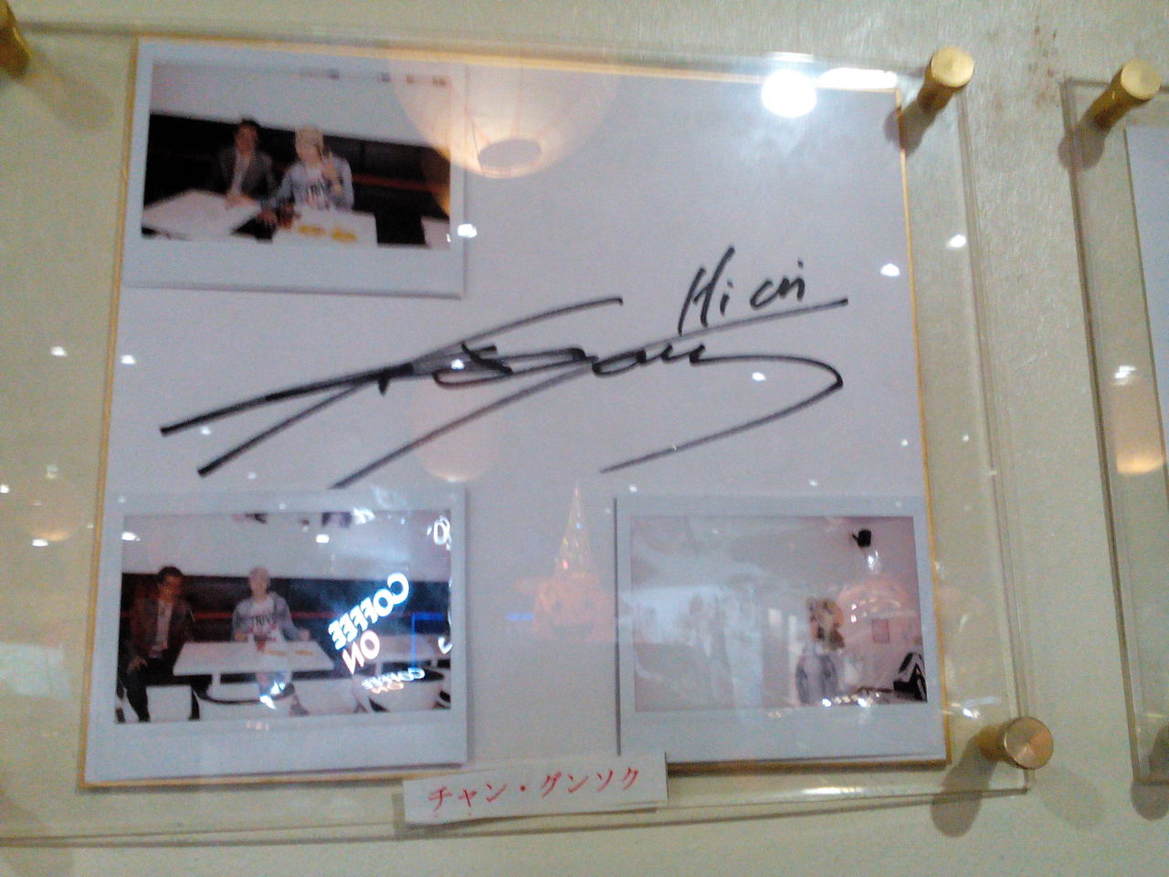 韓国スターが訪れる店、サインや、衣装が飾っていてファンなら、テンションあがります。カウンターで注文したら、先払いすると席まで持っていってくれます。好きなスターのコップがあったら、それに入れてくれます。好きな曲、一曲映像で流してくれます。つねにK-POPの映像が、流れているお店です。