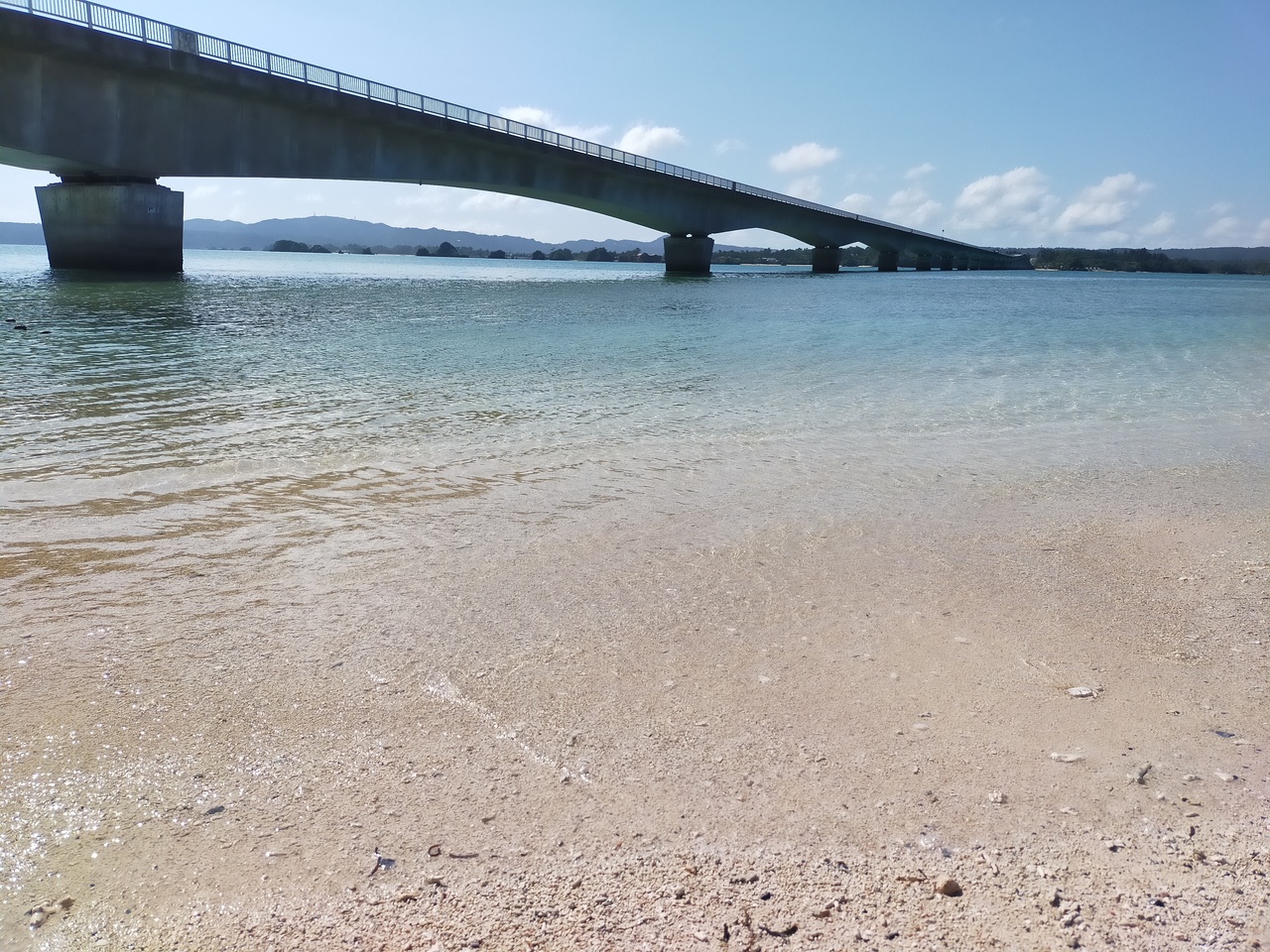 本島と古宇利島を繋ぐ大橋は、車でも行けますが歩いても行けそうです。歩いている人はいましたね。天気が良いと青い空と海が綺麗です。渡った先の砂浜は、海遊びしていた家族もいて、ちょっと入ると魚が見えると言ってましたね。