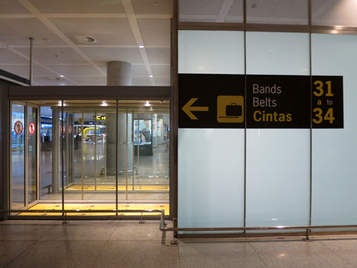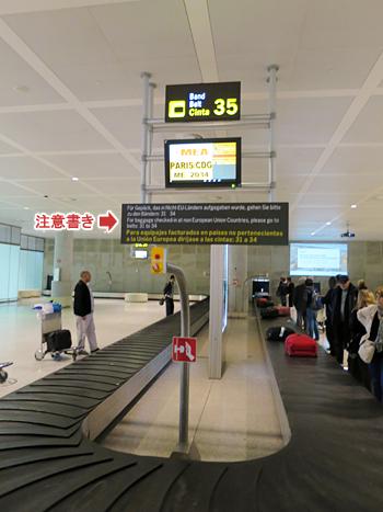 日本から到着した際の荷物の受取ですが、乗ってきた飛行機の便名ごとに表示されているレーンに行くと、「For baggage checked-in at non Europian Union Countries, please go to belts: 31 to 34(EU諸国以外の国でチェックインした荷物は、31から34レーンへ)」と英語で注意書きが掲示されていました。31から34レーンは、通常のレーンの左側、すぐ壁の向こうです。お待ちがえないように。