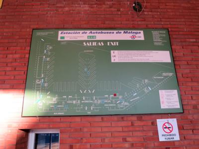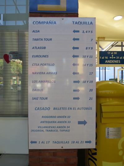 さまざまなバス会社が乗り入れています。会社ごとに窓口(Taquilla)が分かれているので、案内表示板で窓口番号が掲示されていました。また、ターミナルは広く、行き先ごとに乗り場も違い、端から端まで歩くと、けっこうな距離です。窓口で切符を購入した場合、右上に乗り場番号を手書きで書いてくれるので、それを参考に案内板を見てみつけました。