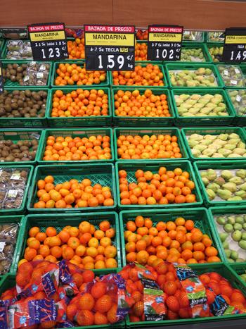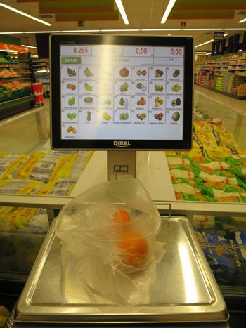 スペイン各地で見かけるスーパーです。ここネルハ店ではパンやお菓子、果物や野菜、肉、魚などの生鮮食品から雑貨までを取り扱っています。果物は一個から量り売りで、スペイン語がわからなくても、アイコン表示でボタンを選べば、値段シールが印刷されるので使いやすかったです。