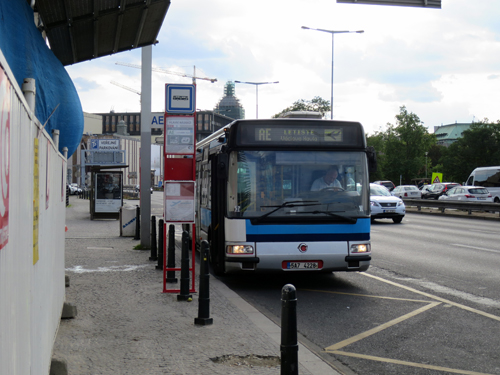 プラハ本駅から空港まで、エアポート エクスプレス(AE)バスを利用しました。駅の乗り場は、改札階からエスカレーターで3階へ上がります。駅は2階がホームで、1階にも出口がありますが、ここにはタクシー乗り場しかありません。バスは3階なので、お間違えなく。また、エレベーターを使うと、通りをはさんで駅の向かいに出てしまいます。バス乗り場は駅を出てすぐの所になるので、エスカレーターで3階へ上がったほうがよいです。