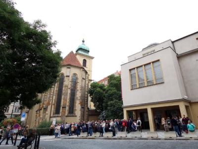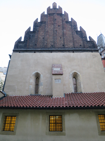 プラハにある教会はたいてい16時や17時までしか見学できませんが、ユダヤ人地区にあるこの旧新シナゴーグは18時まで見学できます。私が行ったのは18時半ですでに閉まった後でしたが、周囲は旧市街広場とは違った雰囲気があるので、そんな時間帯でもガイドさんに連れられたツアーの方達が訪れていました。