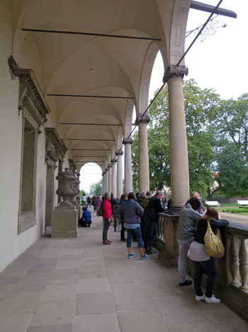 宮殿の中には入れませんでしたが、宮殿の回廊から見る庭園は非常によく手入れされ、あいにくの雨にもかかわらず、ここで記念撮影する人も多かったです。また、ここからカレル庭園内を歩いて、聖ヴィート大聖堂方面へと散策するのも楽しいです。尚、入口では、簡単な荷物検査が行われていました。