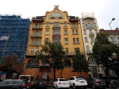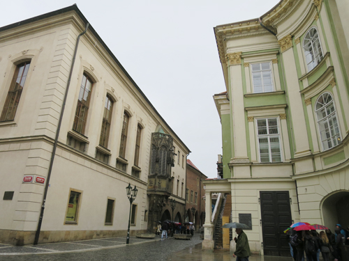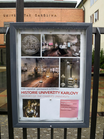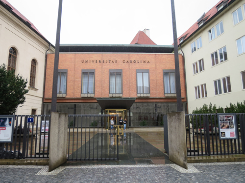 旧市街からヴァーツラフ広場(Vaclavske namesti)へ向かう途中にあり、雨が降っていましたが、団体ツアーが次々に大学前にやって来て、ガイドさんの説明を受けていました。中に入ることはできませんでしたが、入口には「カレル大学の歴史(History of the Charles university)」と書かれた常設展の案内も出ていました。