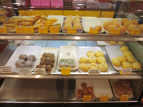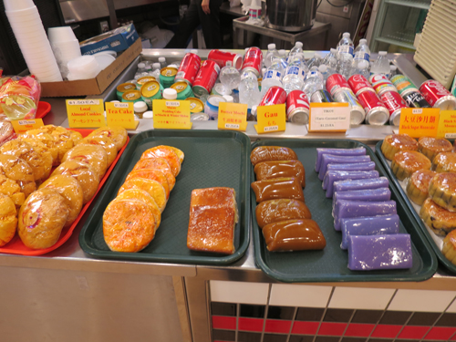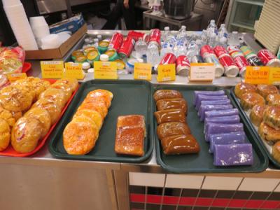 一個から買える中華菓子やパンもおいしかったです。「Hokkaido custard Bun」は表面にクッキー生地をのせたメロンパンみたいで、「Taro Cake」は「さつま芋ケーキ」と書かれていたが、ういろうみたいでした。また、「Ube Doughnut」はタロイモの生地に沖縄の紅芋あんが入ったドーナツで、串団子のように三つ重ねて串にさした「Taro Doughnut Holes」はダンゴ三兄弟みたいでかわいかったです。