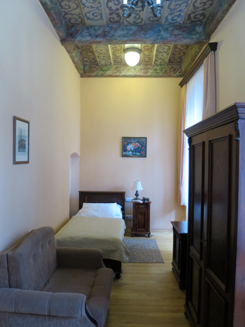立地が最高です。女性一人旅でしたが、旧市街広場の夜景を見に出ても、徒歩一分もかからずホテルに戻れるので安心でした。シングルのお部屋は狭いですが、天井が高いせいか窮屈さも感じません。ただし、部屋の窓は二重になっていますが、通りを行く人の声や車の音は夜11時まで聞こえてきました。