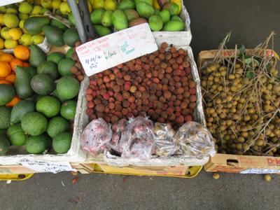 カイルア・コナの中心部にある駐車場の横に露店が並んでいます。とてもローカルな雰囲気で、こじんまりしています。ツアーのガイドさんに「今の時期(5月)のおすすめの果物は?」と尋ねると「ライチ」と言うことだったので、このマーケットで購入しました。日本だと冷凍物しか手に入りづらいですが、ここでは生で手に入ります。