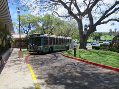 私たちはレンタカーのない旅だったので、カアナパリからラハイナへ行く際に利用しましたが、カアナパリのバス停はホエラーズ ビレッジにあります。片道2ドルで、降車する際は車内の窓際についているヒモをひっぱります。