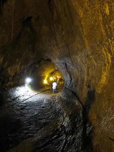 サーストン ラバ チューブの天井を見上げると小さな鍾乳石もできていたりして、この大地の歴史を感じられるような場所でした。天井からはぽたぽた水滴が落ちてくるので、帽子をかぶっていったほうが良いです。それに足元は濡れていて滑りやすかったです。