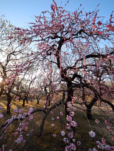 園内には1,300本もの梅があり、早咲きは1割(八重野梅、八重寒紅、白牡丹など)。中咲きが7割(白加賀、月影、新茶青など)。遅咲きが2割(豊後、紅千鳥、小向など)を占めています。そのため、早咲きの見頃が過ぎても、中咲が咲き始め、やがて遅咲きへと移り、長い期間、楽しめるのが、この郷土の森 梅祭りの良いところ。
