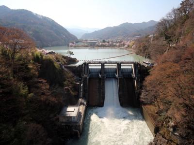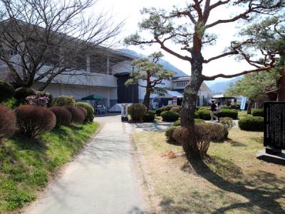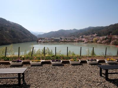 さくらの開花時期だったせいか、入館者には無料でさくら茶がふるまわれ、高遠湖と、対岸には高遠さくらホテル、B & G海洋センター、そして右奥方向には勝間 薬師堂 しだれ桜が見える場所で一服できました。