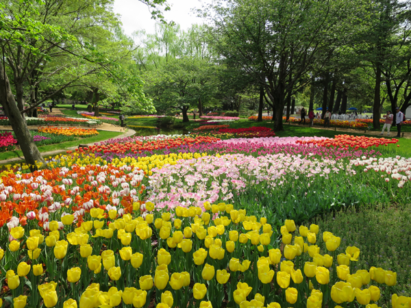 チューリップが有名なオランダのキューケンホフ公園の前園長によりデザインされた、昭和記念公園のチューリップ。渓流にかかる橋を渡り、チューリップを見ながら歩いていると、オランダにいるような錯覚に陥りました。