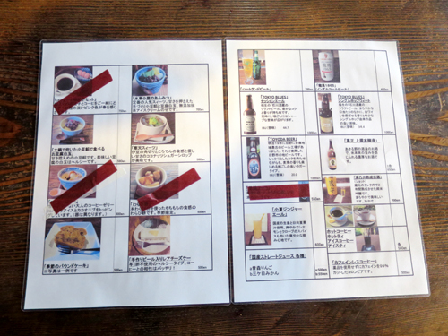 食事メニューとカフェメニューがあり、本日の日替わりメニュー(ドリンク付き1,100円)は「キーマカレー」に「豚丼」。デザートは定番メニュー「水車小屋のあんみつ(700円)」をはじめ、「土鍋で炊いた小豆餡で食べる豆腐白玉(580円)」や「季節のパウンドケーキ(500円)」に「手作りピール入りレアチーズケーキ(500円)」など。