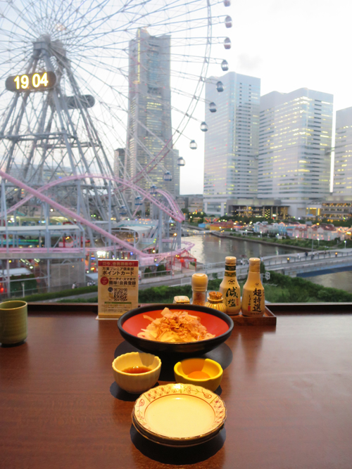 「横浜みなとみらい万葉倶楽部」6階にある食事処です。炙りサーモン(690円)、高菜しらす丼(490円)など居酒屋風のメニューが並んでいますが、味はどれもおいしくて大満足でした。また、窓際のカウンター席からは、よこはまコスモワールド 大観覧車「コスモクロック21」が目の前! 日没後は、15分に1回、約6分間の「大観覧車 光のアート」というライトアップが始まり、それを間近で見れて、とても良かったです。