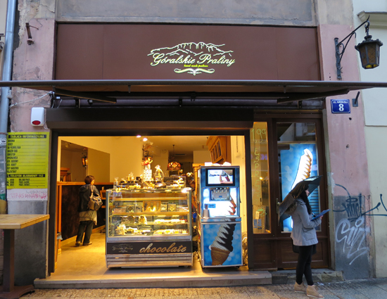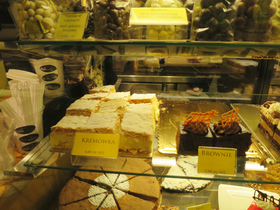 クラクフ旧市街をはじめ、ワルシャワなどにも支店があるケーキ屋さんです。織物会館から王宮方面へと向かう途中のグロツカ通り(Grodzka)にあるお店に行きましたが、バニラとチョコをミックスした背の高いソフトクリームの他にパン、ケーキ、ジェラートなども売っていて、たくさんのお客さんで賑わっていました。私たちはケーキをテイクアウトしましたが、店内で飲食できるスペースもありました。