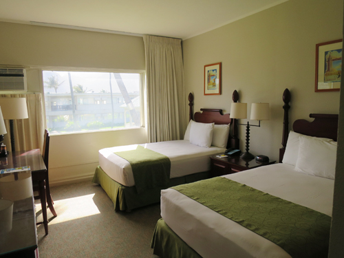 二階のガーデンビュー指定の部屋だったので、ラナイからはお庭しか見えませんでしたが、歩けばすぐにビーチです。バスルームはバスタブ付で、固定式シャワーは勢いが良すぎて初日は使いづらかったですが、慣れれば大丈夫でした。無料Wi-Fiは時々、弱くなったりしましたが、おおむね良好でした。徒歩圏内にABCストアやレストラン、バス乗り場などがあって、レンタカーのない旅でも快適に過ごせるホテルです。